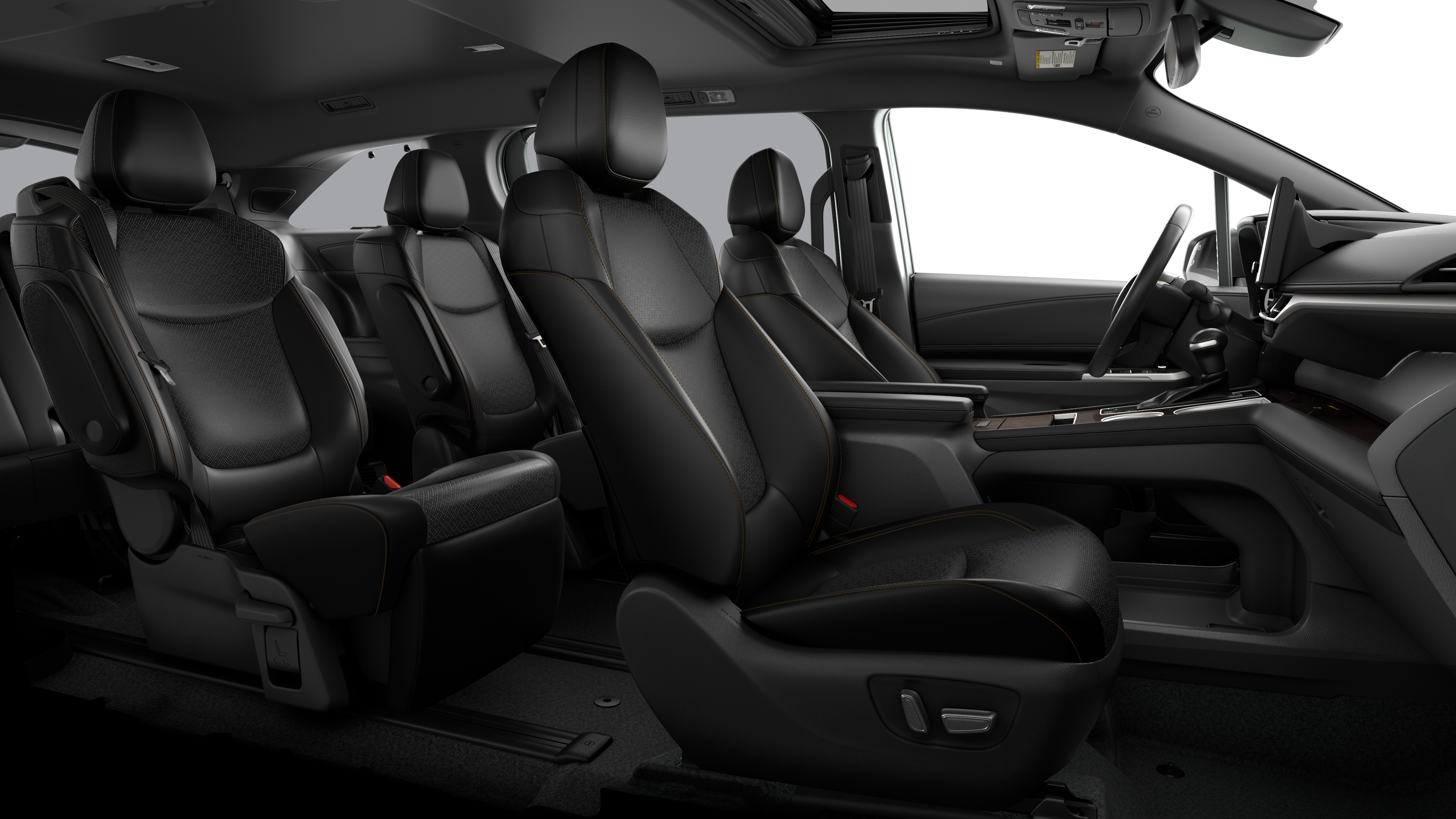 - 7-passenger seating with premium leather-trimmed second-row-seat captain's chairs with super-long-slide feature and ottomans