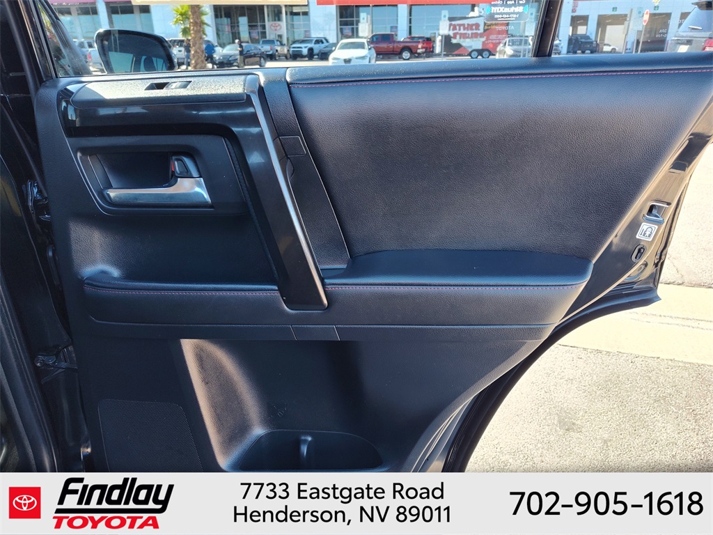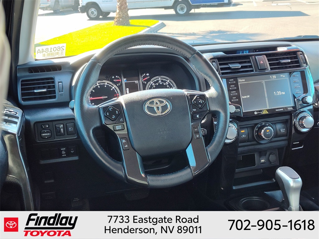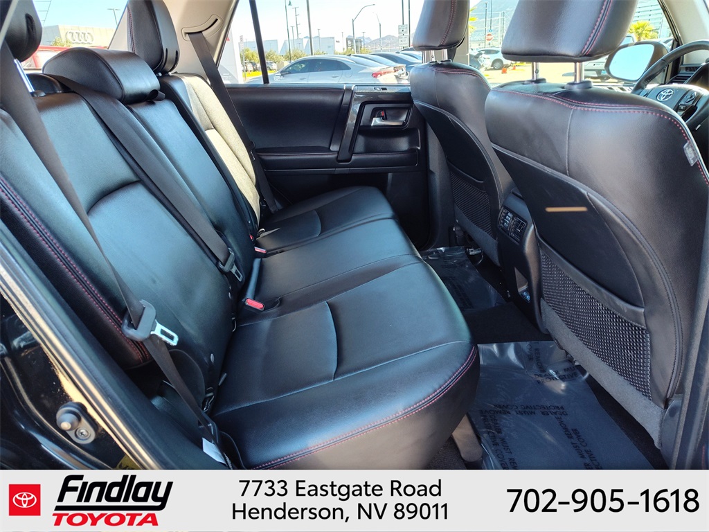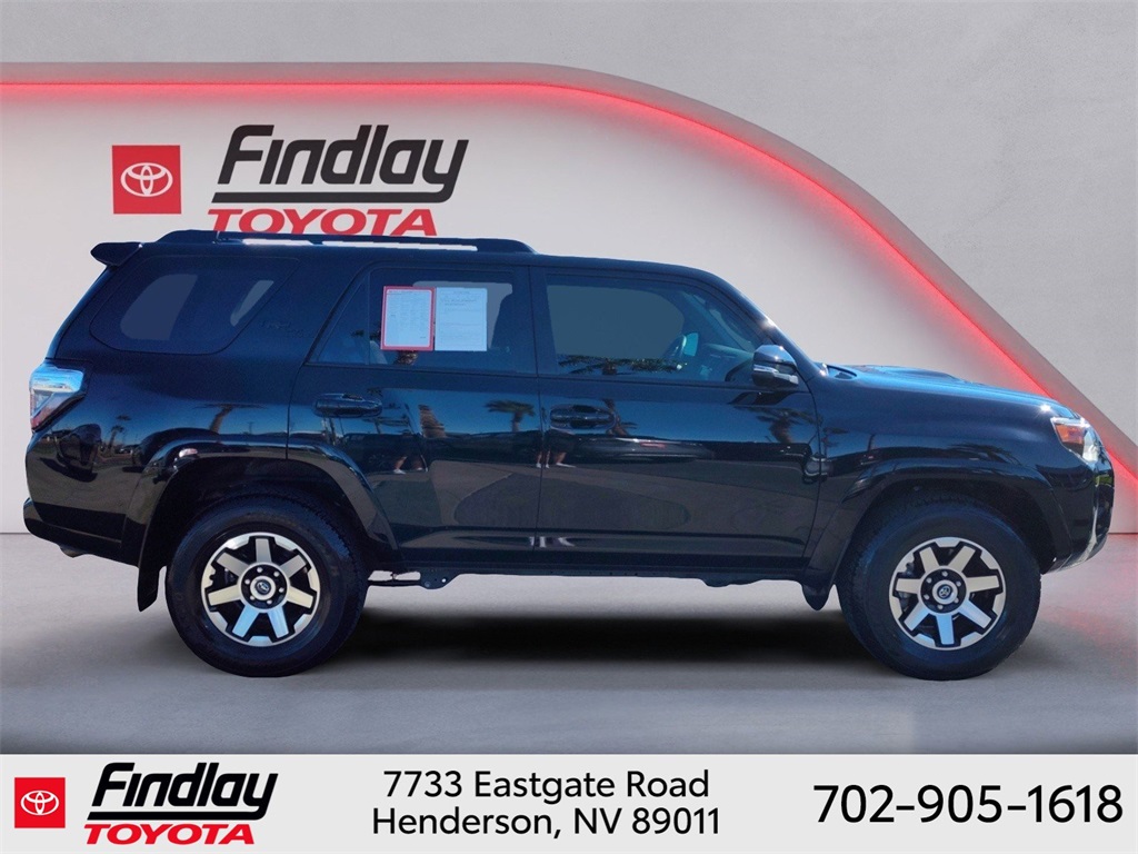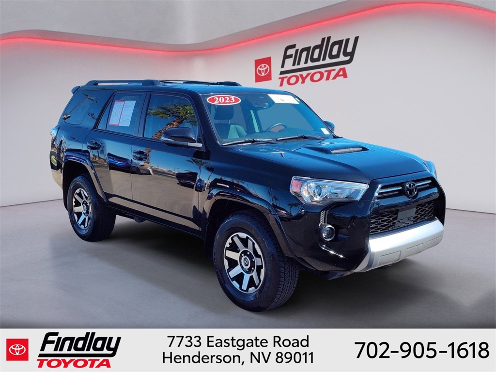 Looking for the best quality used cars near Las Vegas? Findlay Toyota of Henderson is your top destination. As the premier dealership in Nevada, we offer an extensive selection of top-notch pre-owned vehicles, ensuring you find the perfect car to fit your needs and budget. Conveniently located at 7733 Eastgate Rd in the Valley Automall, our dealership spans 12 1⁄2 acres and features a 145,000-square-foot facility, including Nevada’s only Master Certified Toyota Service Department. Our expert sales and financing teams are dedicated to providing a hassle-free buying experience, and our state-of-the-art service center is equipped to handle everything from routine maintenance to major repairs. Our multilingual staff speaks 14 languages, making us accessible to a diverse range of customers. Beyond exceptional service, we are committed to giving back to the Henderson community through initiatives like Toys for Tots and the Las Vegas Rescue Mission. Discover why Findlay Toyota of Henderson is the trusted choice for quality used cars and exceptional service. Visit us today and drive home in your dream car! This Toyota 4Runner is equipped with the following equipment: Toyota Gold Certified Certified, 4WD, Black/Graphite w/Leather Seat Trim, 3.727 Axle Ratio, 4-Wheel Disc Brakes, 8 Speakers, ABS brakes, Air Conditioning, Alloy wheels, AM/FM radio: SiriusXM, Anti-whiplash front head restraints, Apple CarPlay/Android Auto, Auto High-beam Headlights, Auto-dimming Rear-View mirror, Black Roof Rails, Brake assist, Bumpers: body-color, Compass, Driver door bin, Driver vanity mirror, Dual front impact airbags, Dual front side impact airbags, Electronic Stability Control, Emergency communication system: Safety Connect (1-year trial), Exterior Parking Camera Rear, Front anti-roll bar, Front Bucket Seats, Front Center Armrest, Front fog lights, Front reading lights, Front wheel independent suspension, Garage Door Opener, Garage door transmitter: HomeLink, Heated door mirrors, Heated Front Bucket Seats, Heated front seats, Heated Outside Rear-View Mirrors, Illuminated entry, Knee airbag, Leather Shift Knob, Low tire pressure warning, Navigation System, Occupant sensing airbag, Outside temperature display, Overhead airbag, Overhead console, Panic alarm, Passenger door bin, Passenger vanity mirror, Power door mirrors, Power driver seat, Power passenger seat, Power steering, Power windows, Radio: Premium Audio w/Dynamic Navigation, Rear anti-roll bar, Rear seat center armrest, Rear window defroster, Rear window wiper, Remote keyless entry, Security system, SofTex Seat Trim, Speed control, Speed-sensing steering, Split folding rear seat, Spoiler, Steering wheel mounted audio controls, Tachometer, Telescoping steering wheel, Tilt steering wheel, Traction control, Trip computer, Turn signal indicator mirrors, Variably intermittent wipers, and Wheels: 17" Unique 7-Spoke Off-Road Alloy. ** This 2023 Toyota 4Runner is equipped with 4.0L V6 DOHC 24V 4WD**, ** and this 4Runner is trimmed in Midnight Black Metallic with Black/Graphite