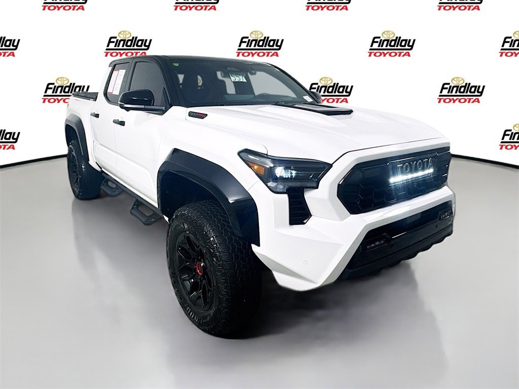 Looking for the best quality used cars near Las Vegas? Findlay Toyota of Henderson is your top destination. As the premier dealership in Nevada, we offer an extensive selection of top-notch pre-owned vehicles, ensuring you find the perfect car to fit your needs and budget. Conveniently located at 7733 Eastgate Rd in the Valley Automall, our dealership spans 12 1⁄2 acres and features a 145,000-square-foot facility, including Nevada’s only Master Certified Toyota Service Department. Our expert sales and financing teams are dedicated to providing a hassle-free buying experience, and our state-of-the-art service center is equipped to handle everything from routine maintenance to major repairs. Our multilingual staff speaks 14 languages, making us accessible to a diverse range of customers. Beyond exceptional service, we are committed to giving back to the Henderson community through initiatives like Toys for Tots and the Las Vegas Rescue Mission. Discover why Findlay Toyota of Henderson is the trusted choice for quality used cars and exceptional service. Visit us today and drive home in your dream car! This Toyota Tacoma Hybrid is equipped with the following equipment: 2.4L I4 PDI Hybrid Turbocharged DOHC 16V, 4-Wheel Disc Brakes, 9 Speakers, ABS brakes, Air Conditioning, Alloy wheels, AM/FM radio: SiriusXM, Anti-whiplash front head restraints, Apple CarPlay/Android Auto, Auto High-beam Headlights, Auto-dimming Rear-View mirror, Automatic temperature control, Brake assist, Bumpers: body-color, Driver door bin, Driver vanity mirror, Dual front impact airbags, Dual front side impact airbags, Electronic Stability Control, Emergency communication system: Safety Connect (1-year trial), Exterior Parking Camera Rear, Four wheel independent suspension, Front anti-roll bar, Front Bucket Seats, Front Center Armrest, Front dual zone A/C, Front fog lights, Front reading lights, Fully automatic headlights, Garage door transmitter: HomeLink, Heads-Up Display, Heated door mirrors, Heated front seats, Heated steering wheel, Htd & Vent TRD Pro IsoDynamic Performance Seats, Illuminated entry, JBL Premium Audio, Knee airbag, Leather Shift Knob, Leather steering wheel, Low tire pressure warning, Navigation system: Drive Connect (1 year trial) includes Cloud Navigation with real time traffic and Google POI, Occupant sensing airbag, Outside temperature display, Overhead airbag, Overhead console, Panic alarm, Passenger door bin, Passenger vanity mirror, Power door mirrors, Power driver seat, Power moonroof, Power passenger seat, Power steering, Power windows, Radio: 14" Toyota Audio Multimedia, Rear anti-roll bar, Rear step bumper, Rear window defroster, Remote keyless entry, Security system, SofTex Seat Trim, Speed control, Speed-sensing steering, Split folding rear seat, Steering wheel mounted audio controls, Tachometer, Telescoping steering wheel, Tilt steering wheel, Traction control, Trip computer, Turn signal indicator mirrors, Variably intermittent wipers, Ventilated front seats, and Wheels: 18" Black TRD Pro Alloy. ** This 2024 Toyota Tacoma Hybrid is equipped with 2.4L I4 PDI Hybrid Turbocharged DOHC 16V 4WD**, ** and this Tacoma Hybrid is trimmed in Ice Cap w/Black Roof with Cockpit Red interior**, 2.4L I4 PDI Hybrid Turbocharged DOHC 16V.