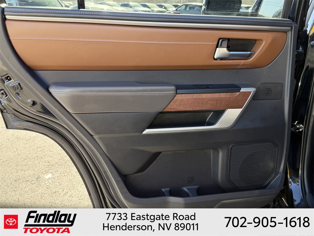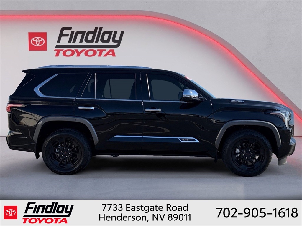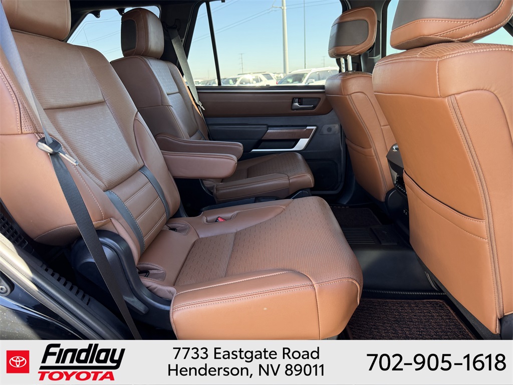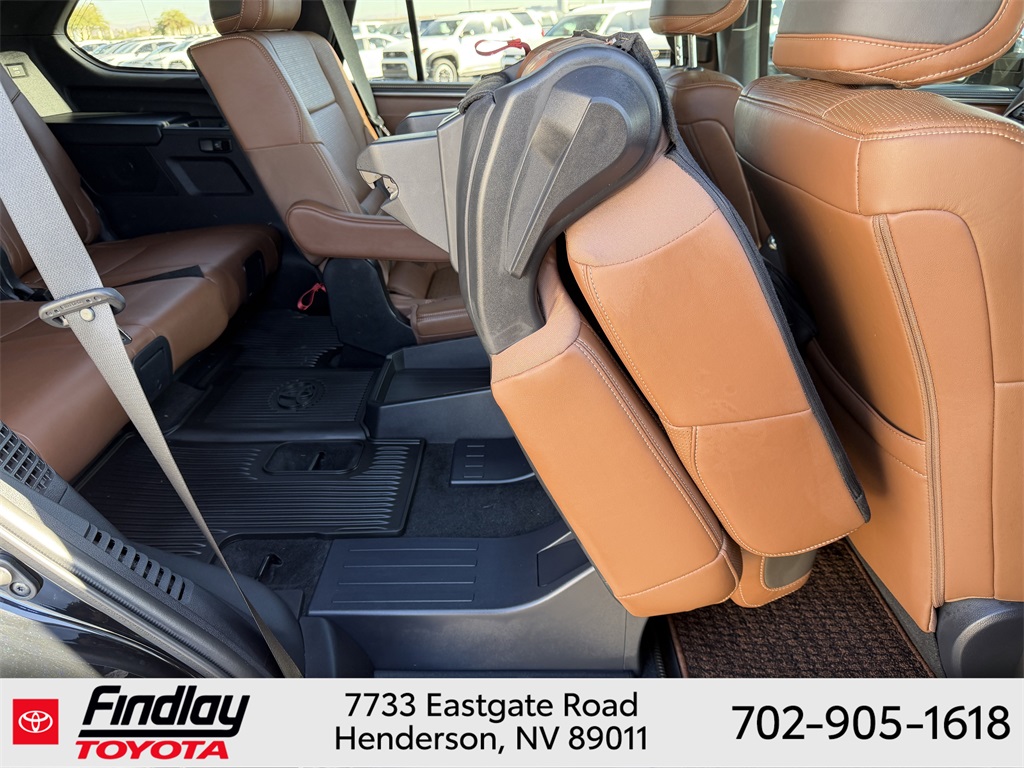 Looking for the best quality used cars near Las Vegas? Findlay Toyota of Henderson is your top destination. As the premier dealership in Nevada, we offer an extensive selection of top-notch pre-owned vehicles, ensuring you find the perfect car to fit your needs and budget. Conveniently located at 7733 Eastgate Rd in the Valley Automall, our dealership spans 12 1⁄2 acres and features a 145,000-square-foot facility, including Nevada’s only Master Certified Toyota Service Department. Our expert sales and financing teams are dedicated to providing a hassle-free buying experience, and our state-of-the-art service center is equipped to handle everything from routine maintenance to major repairs. Our multilingual staff speaks 14 languages, making us accessible to a diverse range of customers. Beyond exceptional service, we are committed to giving back to the Henderson community through initiatives like Toys for Tots and the Las Vegas Rescue Mission. Discover why Findlay Toyota of Henderson is the trusted choice for quality used cars and exceptional service. Visit us today and drive home in your dream car! This Toyota Sequoia is equipped with the following equipment: V6 Hybrid, 10-Speed Automatic, 4WD, 14 Speakers, 20" Alloy Wheels, 3rd row seats: split-bench, 4-Wheel Disc Brakes, ABS brakes, Air Conditioning, Alloy wheels, AM/FM radio: SiriusXM, Anti-whiplash front head restraints, Apple CarPlay/Android Auto, Auto High-beam Headlights, Auto tilt-away steering wheel, Auto-dimming door mirrors, Auto-dimming Rear-View mirror, Automatic temperature control, Brake assist, Bumpers: body-color, Compass, Delay-off headlights, Driver door bin, Driver vanity mirror, Dual front impact airbags, Dual front side impact airbags, Electronic Stability Control, Emergency communication system: Safety Connect (10-year trial), Exterior Parking Camera Rear, Front anti-roll bar, Front Bucket Seats, Front Center Armrest w/Storage, Front dual zone A/C, Front fog lights, Front reading lights, Front wheel independent suspension, Fully automatic headlights, Garage door transmitter: HomeLink, Genuine wood door panel insert, Headlight cleaning, Heated & Ventilated Front Seats, Heated door mirrors, Heated front seats, Heated rear seats, Heated steering wheel, Illuminated entry, Knee airbag, Leather Shift Knob, Leather steering wheel, Low tire pressure warning, Memory seat, Navigation system: Drive Connect (1 year trial) includes Cloud Navigation with real time traffic and Google POI, Occupant sensing airbag, Outside temperature display, Overhead airbag, Overhead console, Panic alarm, Passenger door bin, Passenger vanity mirror, Power door mirrors, Power driver seat, Power Liftgate, Power moonroof, Power passenger seat, Power steering, Power windows, Premium audio system: JBL, Premium Leather Seat Trim, Radio: 14" Toyota Audio Multimedia w/JBL Prem Aud, Rain sensing wipers, Rear air conditioning, Rear reading lights, Rear seat center armrest, Rear window defroster, Rear window wiper, Reclining 3rd row seat, Remote keyless entry, Security system, Speed control, Speed-sensing steering, Split folding rear seat, Spoiler, Sport steering wheel, Steering wheel mounted audio controls, Tachometer, Telescoping steering wheel, Tilt steering wheel, Traction control, Trip computer, Turn signal indicator mirrors, Variably intermittent wipers, Ventilated front seats, Ventilated rear seats, and Voltmeter. ** This 2025 Toyota Sequoia is equipped with V6 Hybrid 4WD**, ** and this Sequoia is trimmed in Midnight Black Metallic with Saddle Tan interior**, V6 Hybrid, 10-Speed Automatic, 4WD.